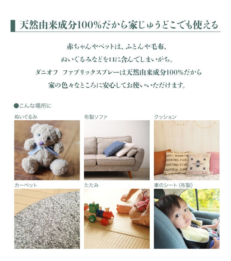 天然由来成分100%なので、赤ちゃんやペットなどが口に含んでしまいがちな布団や毛布にもお使い頂けます。